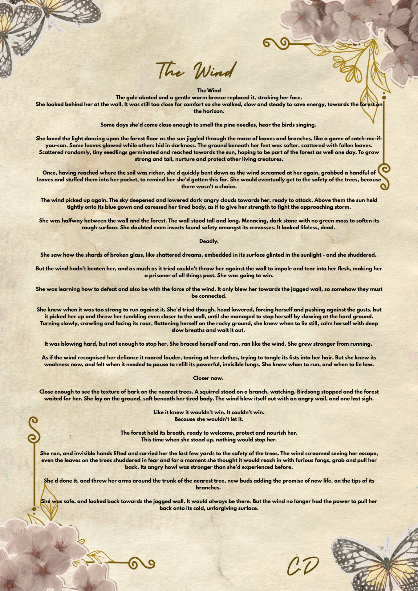 She was safe, and looked back towards the jagged wall. It would always be there. But the wind no longer had the power to pull her back onto its cold, unforgiving surface.